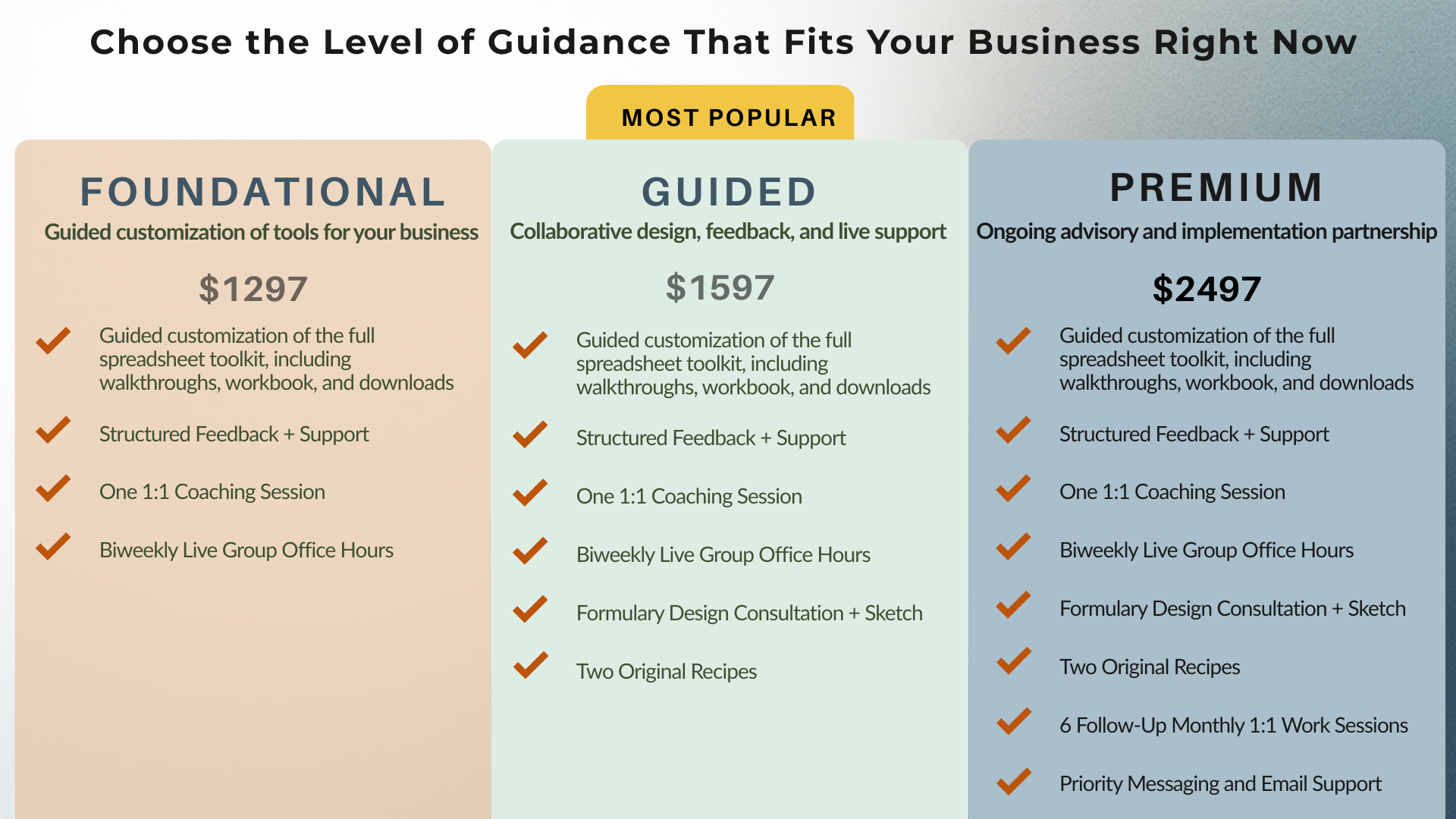 - You’ll design a more streamlined operation that feels calmer, more sustainable, and easier to repeat as your business grows.